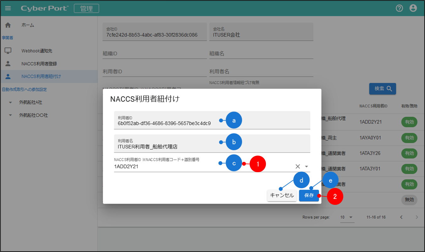 | d | キャンセルボタン | 入力した内容を破棄して「NACCS 利用者情報紐付け画面」を閉じます。 | ||