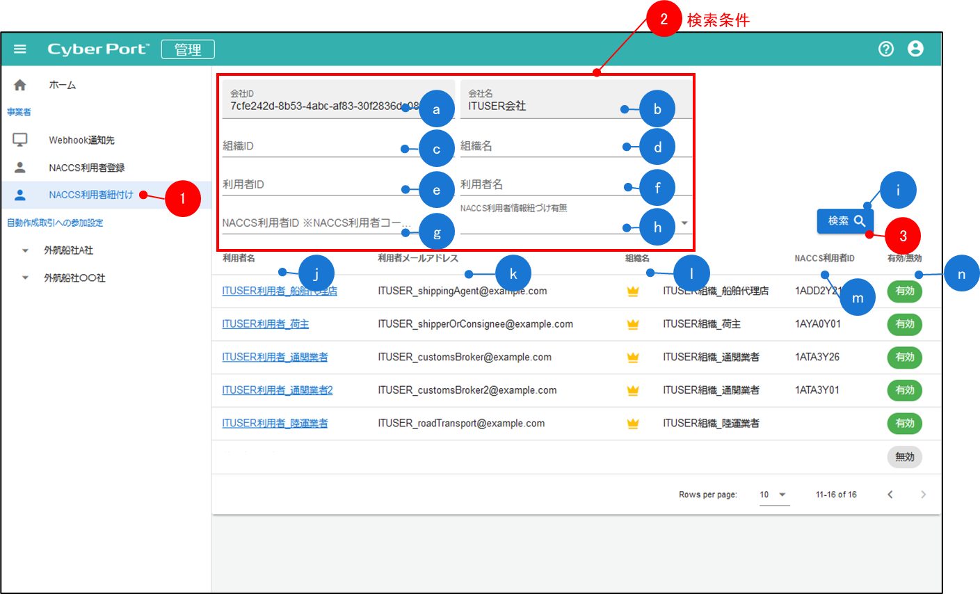 | h | NACCS 利用者情報紐付け有無 | 指定なし:検索条件としない有:NACCS 利用者情報が紐付けられた利用者無:NACCS 利用者情報が紐付けられていない利用者 | |