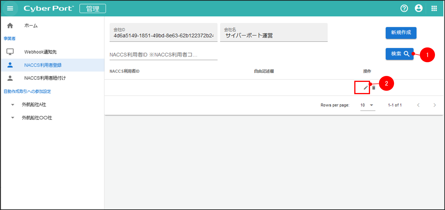 一覧表示部の編集ボタンを押下し「NACCS 利用者登録編集画面」を開きます。