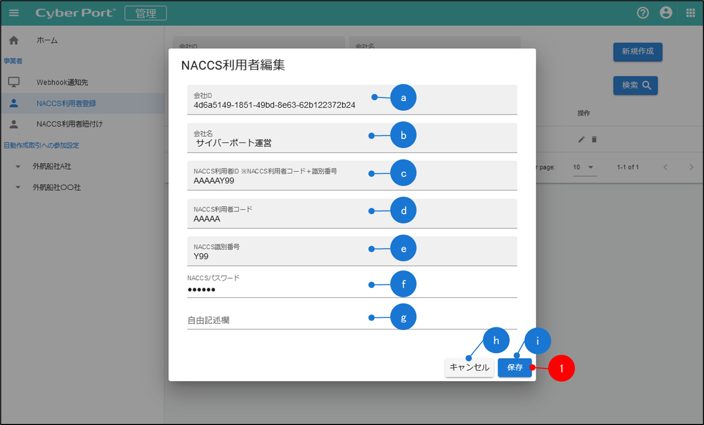 | h | キャンセルボタン | 入力した内容を破棄して「NACCS 利用者情報登録画面」を閉じます。 | ||