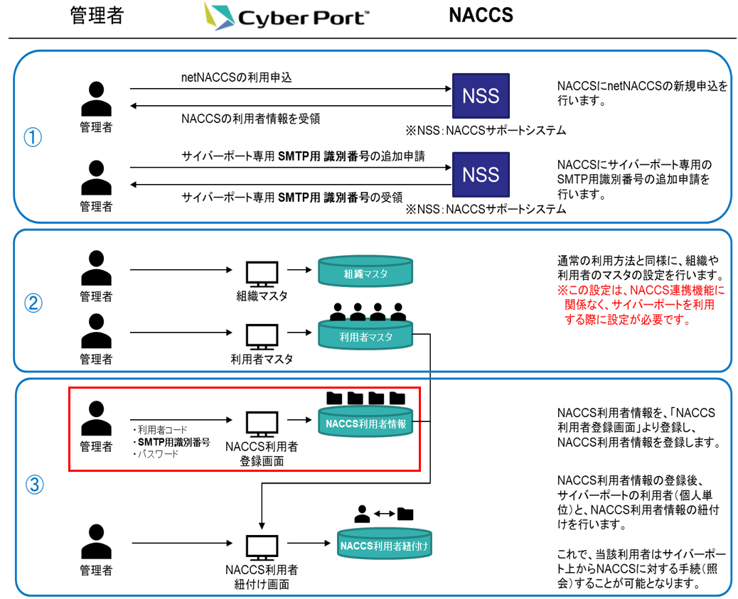 本章では、上図 ③ 内赤枠に記載の NACCS 利用者情報の登録の操作について記載します。