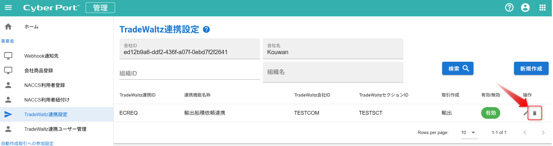 会社の配下に作成したTradeWaltz連携設定を削除する場合は、一覧の削除アイコンをクリックします。