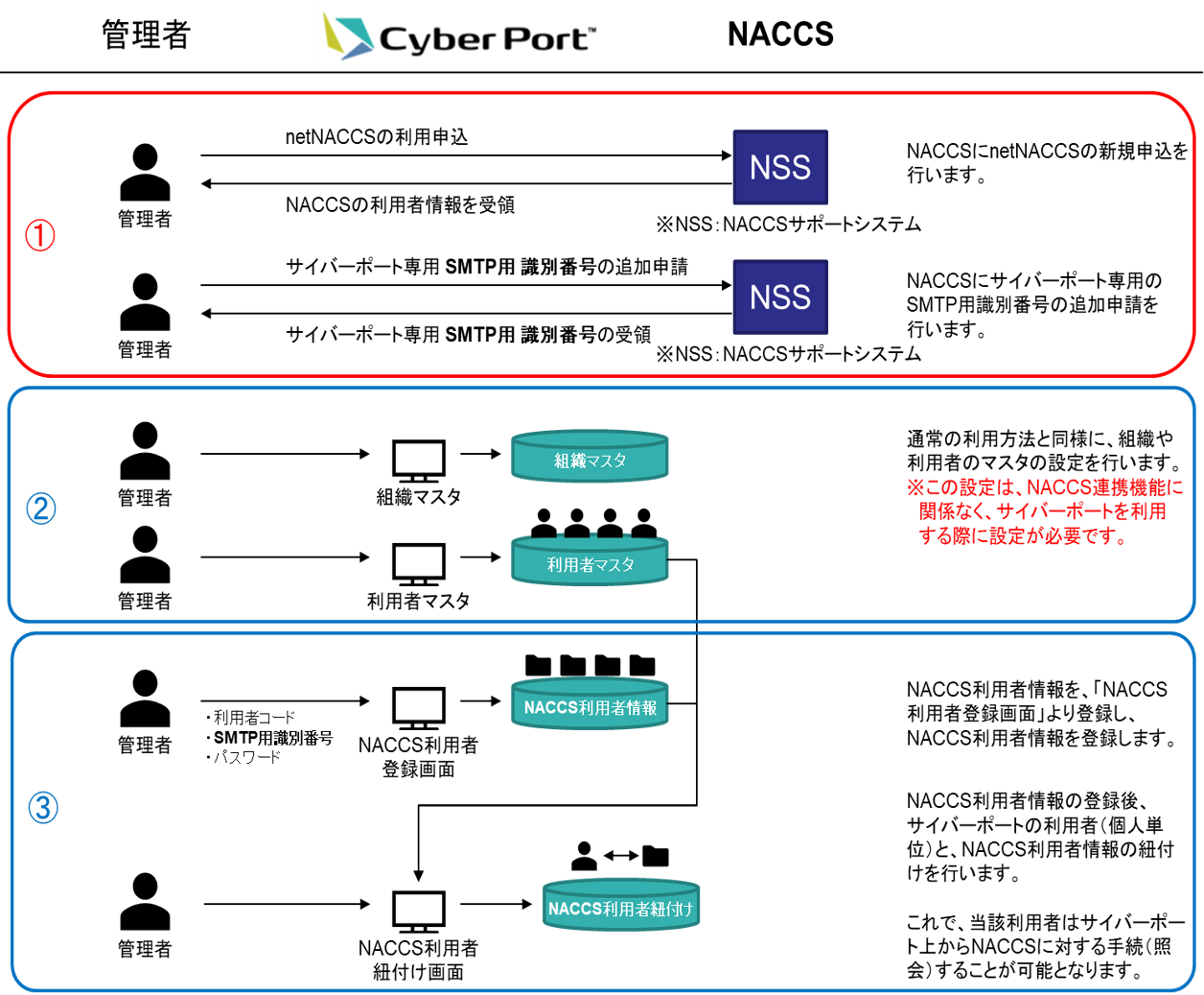 サイバーポートから NACCS へ情報連携する際の利用者情報(利用者コード、識別番号、パスワード)を NACCS から払い出してもらうため、NSS(NACCS サポートシステム)より、NACCS への利用申込を行います。