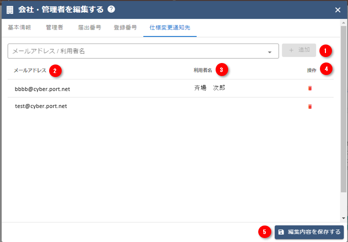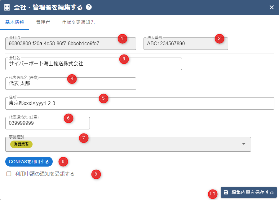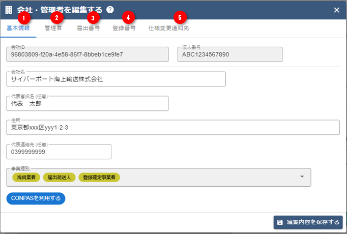 上記画面で編集した内容を、サイバーポートの会社情報として保存するには、「編集内容を保存する」ボタンをクリックします。