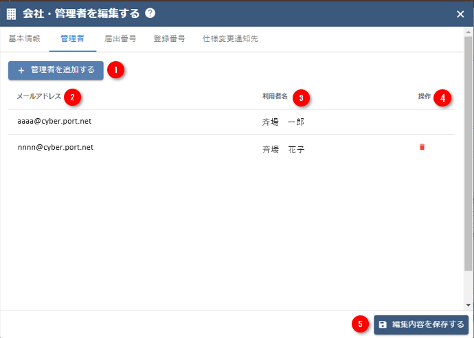 御社のサイバーポート利用者の中から、新たに管理者を追加したり、現在の管理者を削除する場合に、この画面を使用します。
