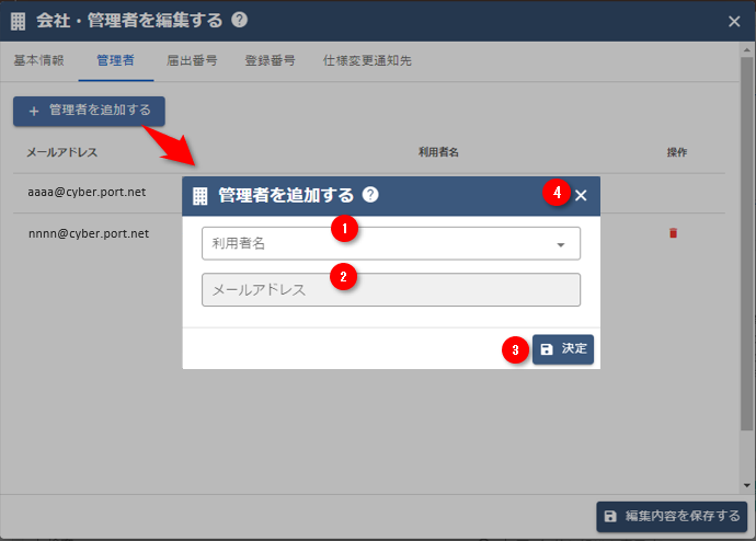 この会社で登録されている利用者の中から、管理者として登録される利用者のメールアドレスです。