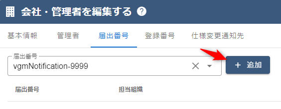 届出番号を追加する場合は、下記の欄から届出番号を選択し、追加ボタンをクリックします。