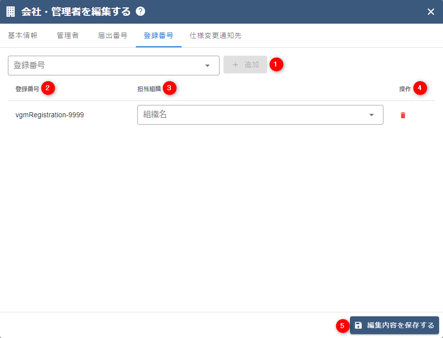 登録番号に変更がある場合は、この画面を使用して変更します。