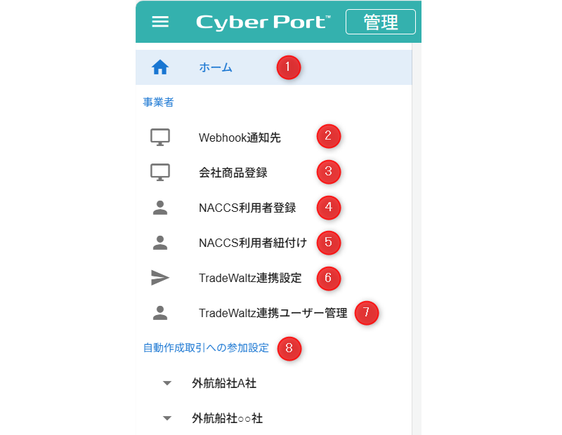 CyberPort 管理者メニューで、利用可能な機能をメニューとして表示します。