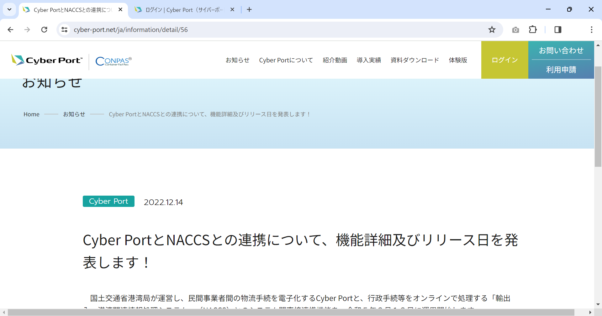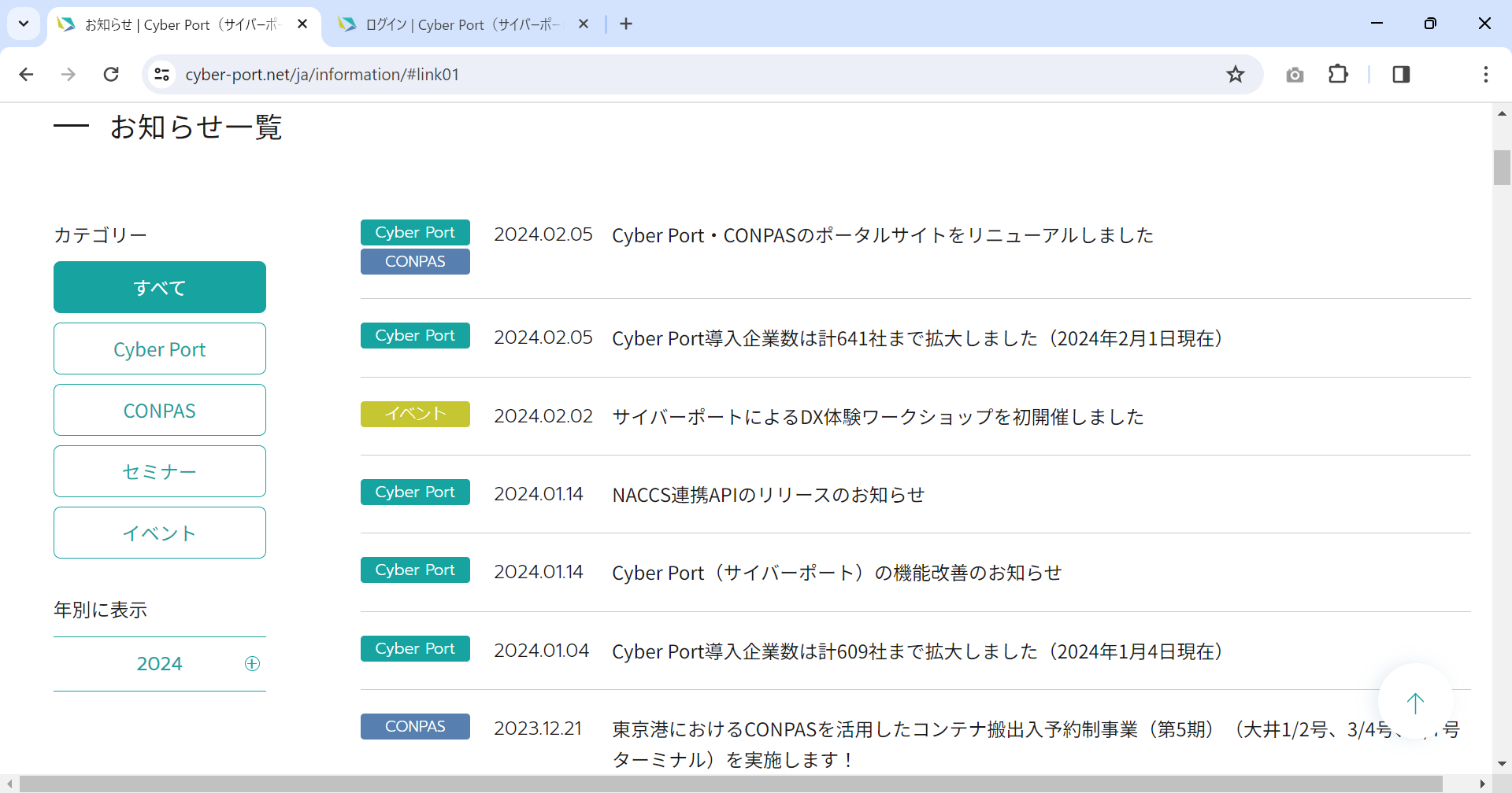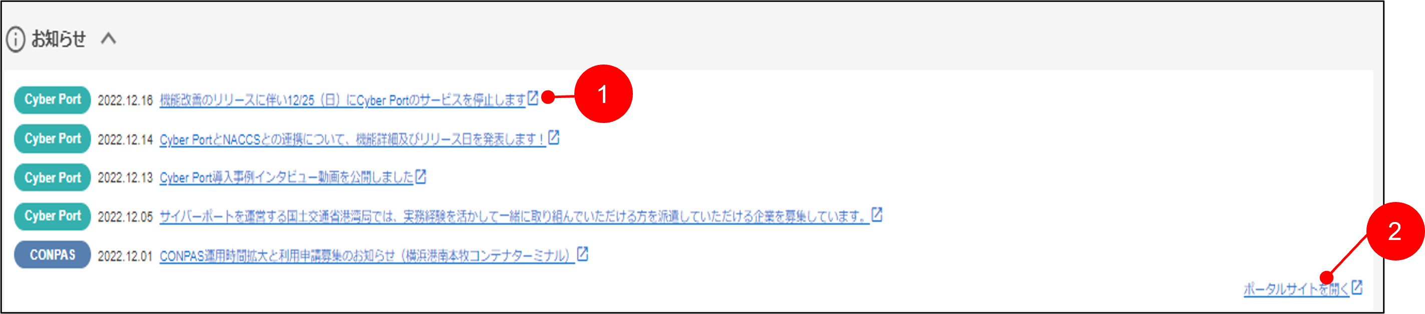 サイバーポートの ポータルサイト に掲載されている「お知らせ」情報を表示します。