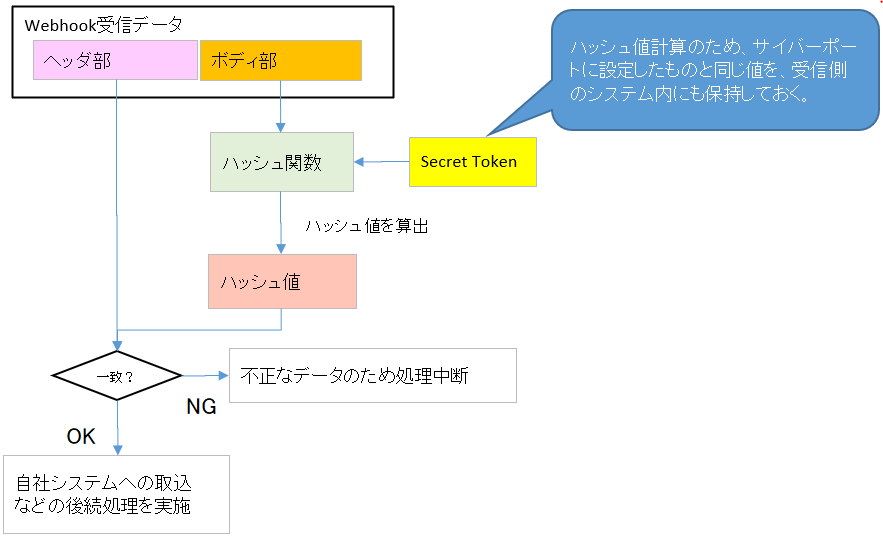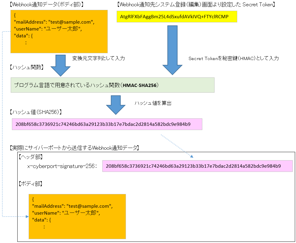 通知を受けるシステムやアプリケーション側では、Webhook 通知先システムに設定した同様のシークレットトークンを用いてハッシュ署名を作成し、そのハッシュ署名と CyberPort からの POST データのハッシュ署名(ヘッダ:x-cyberport-signature-256)が一致することを確認することで、不正な送信データではないことを判別できます。