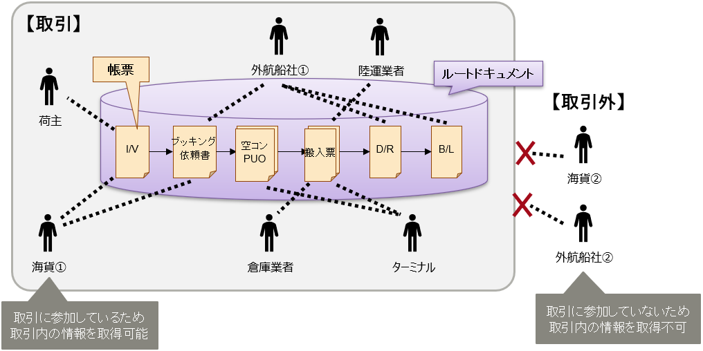 「取引」とは、貿易取引に携わる荷主/海貨/船社等の関係組織と、それら関係組織間での帳票(貿易取引に係る各種書類)1のやり取りと定義します。関係組織が作成した帳票を他の関係組織に共有(=情報連携)することがくり返され、これら一連の作業が「取引」となります。