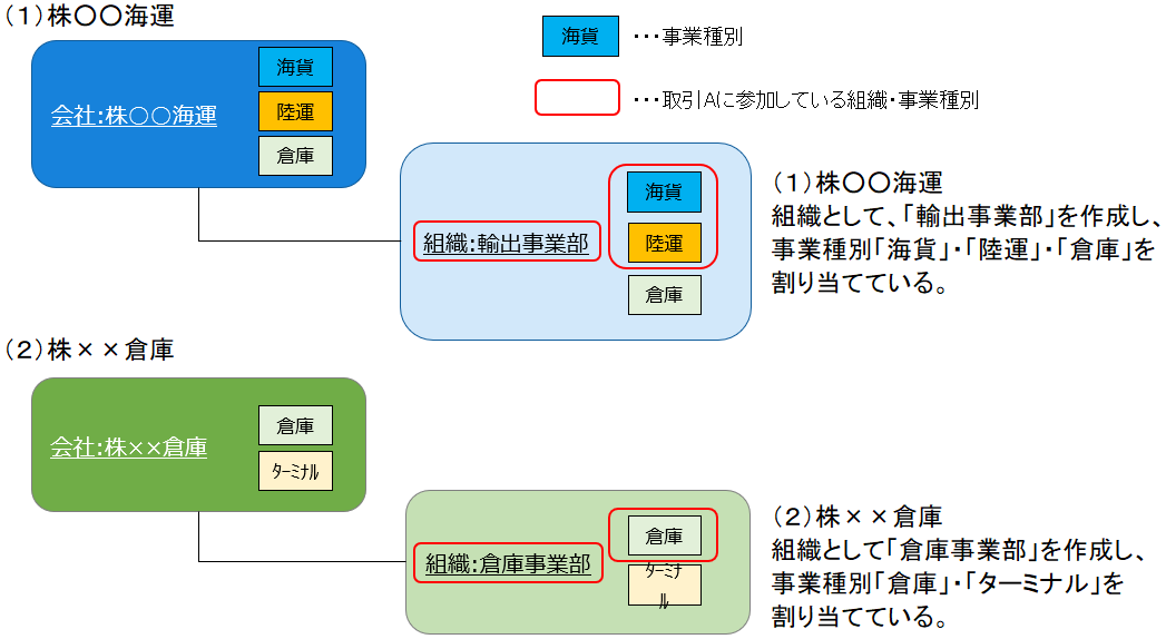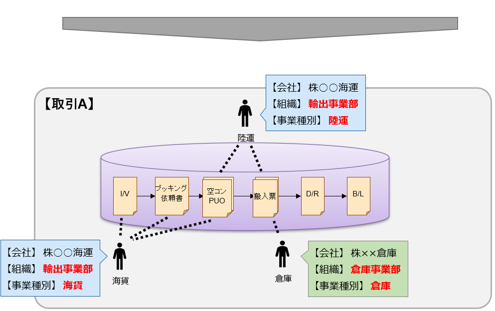 例では、株 ○○ 海運の輸出事業部は、「海貨」・「陸運」の事業種別で参加している。 同様に、株 ×× 倉庫の倉庫事業部は、「倉庫」の事業種別で参加している。 取引関係先の追加や帳票アクセス権限設定は、例のような組織・事業種別の単位で行われる。