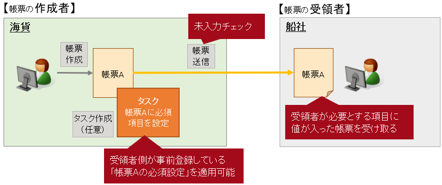タスクに「帳票の受領者が必要とする項目」を設定することで、帳票の作成者は入力が必要な項目の判断が可能になることに加えて未入力チェックが有効になります。