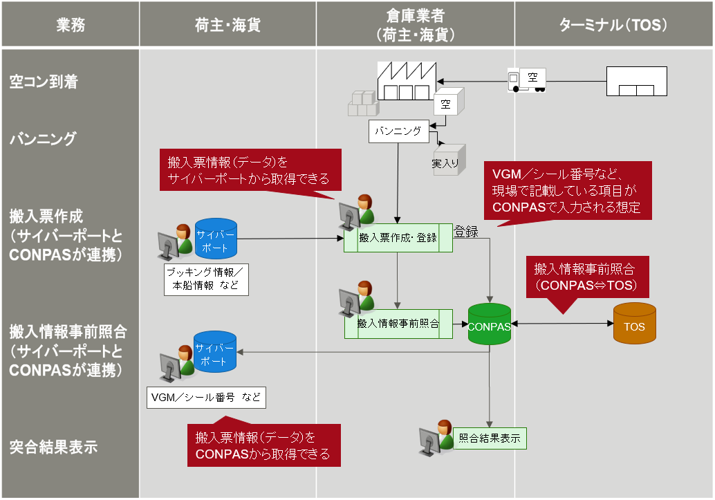 CONPAS の「搬入情報事前照合機能」にて入力された情報をサイバーポートに連携することにより、サイバーポートの後続業務にて CONPAS の持つ情報を利用する。