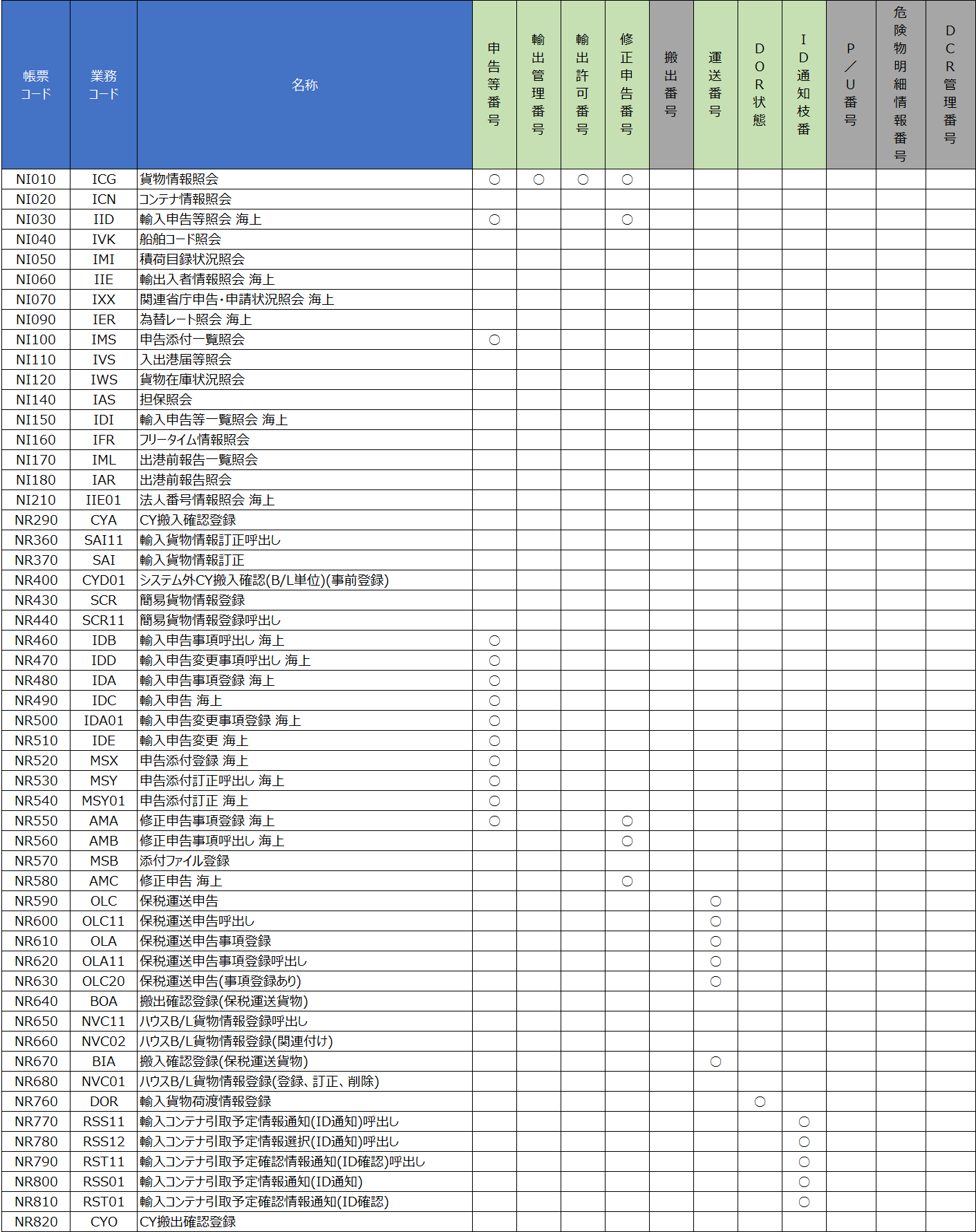 NACCS情報の表示項目の仕様を一覧で記載します。