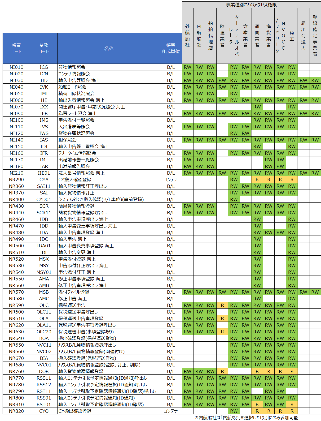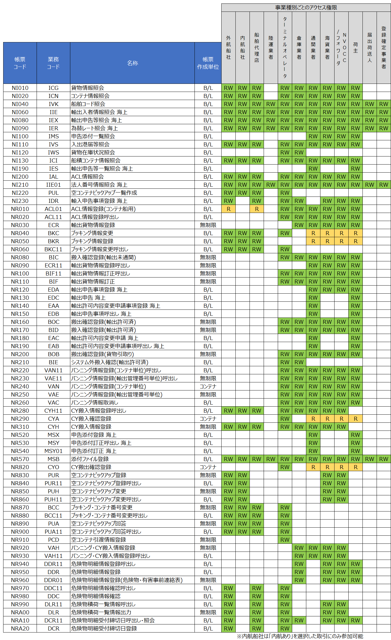 取引で取り扱うNACCS連携用帳票の一覧と事業種別ごとのアクセス権限について記載します。