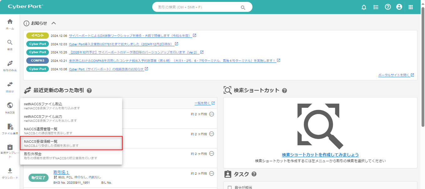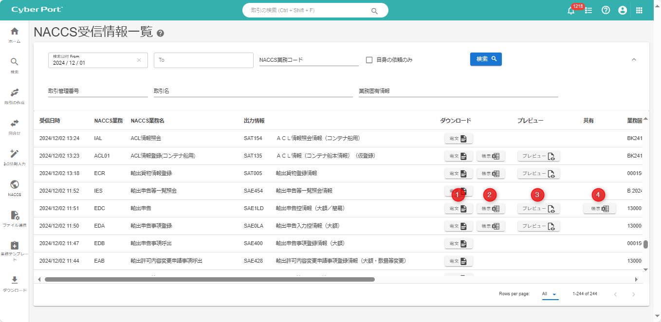NACCS連携に関する受信情報(処理結果通知・出力情報電文など)の一覧を表示します。