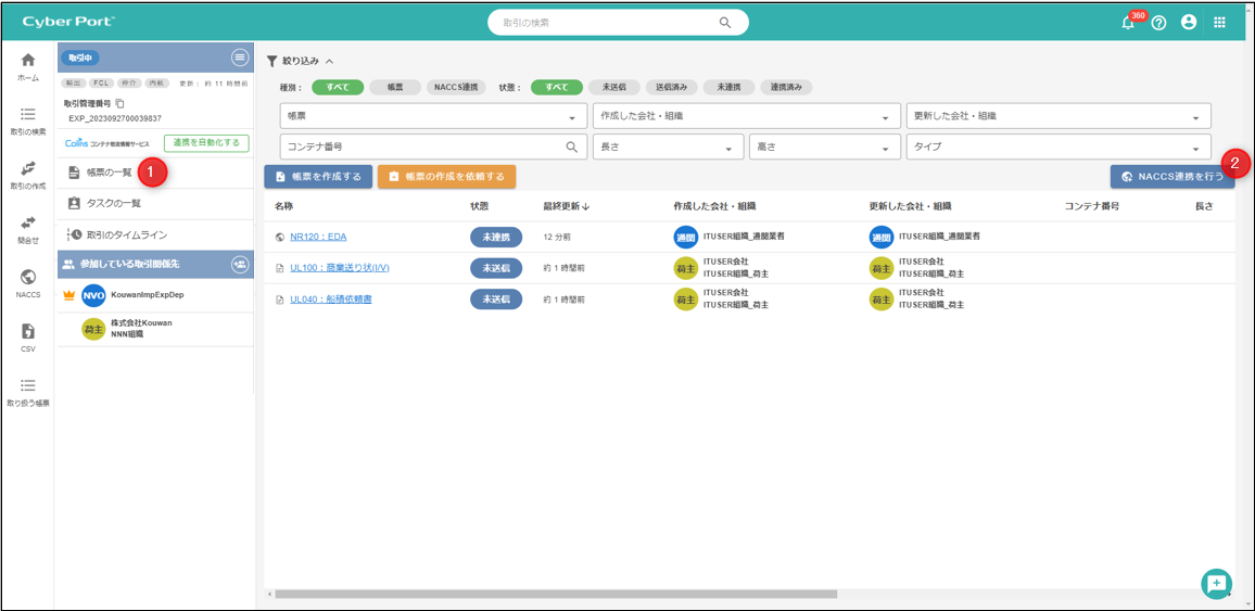 取引左メニューの「帳票の一覧」を押下すると、「取引の帳票およびNACCS連携用帳票一覧画面」が表示されます。