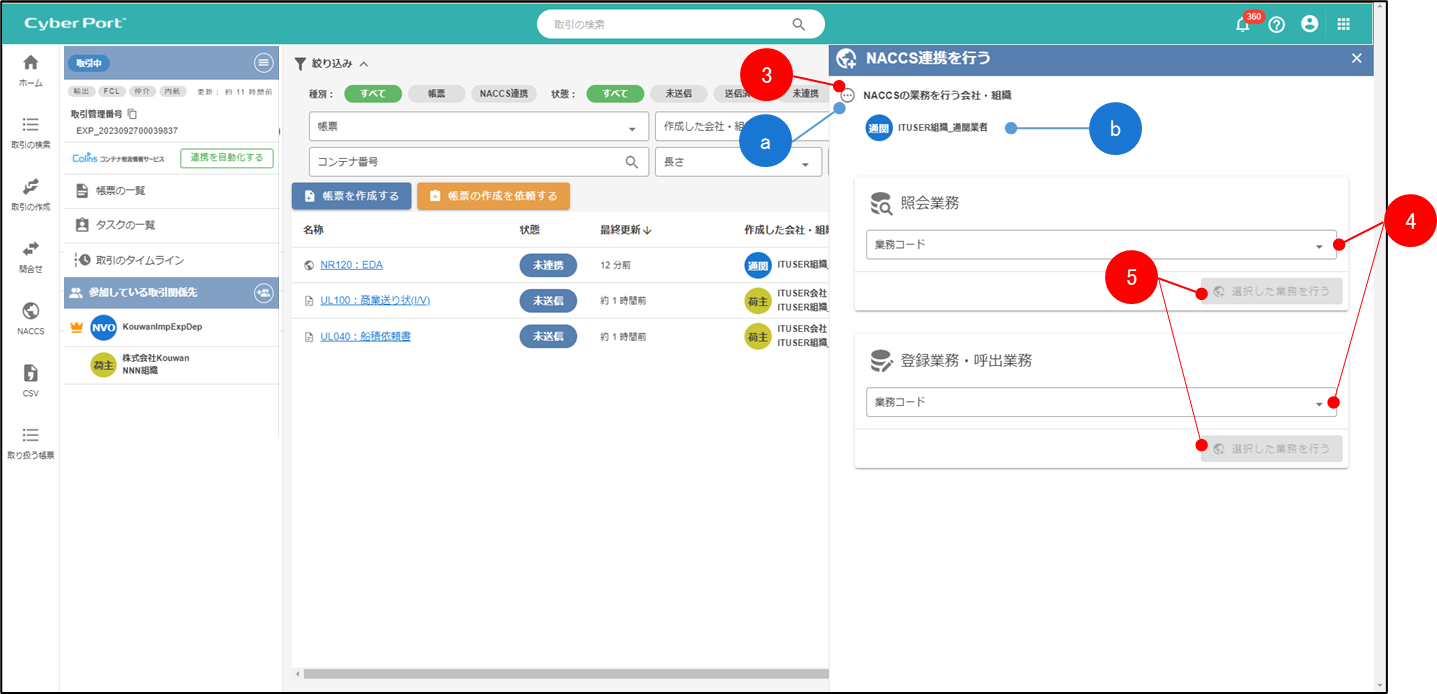 | a | NACCS連携を行う会社・組織の選択 | アイコンを押下するとユーザーの所属している組織のうち当該取引に参加中の組織が一覧表示されます。 選択した組織が「NACCS連携を行う組織」となります。 |