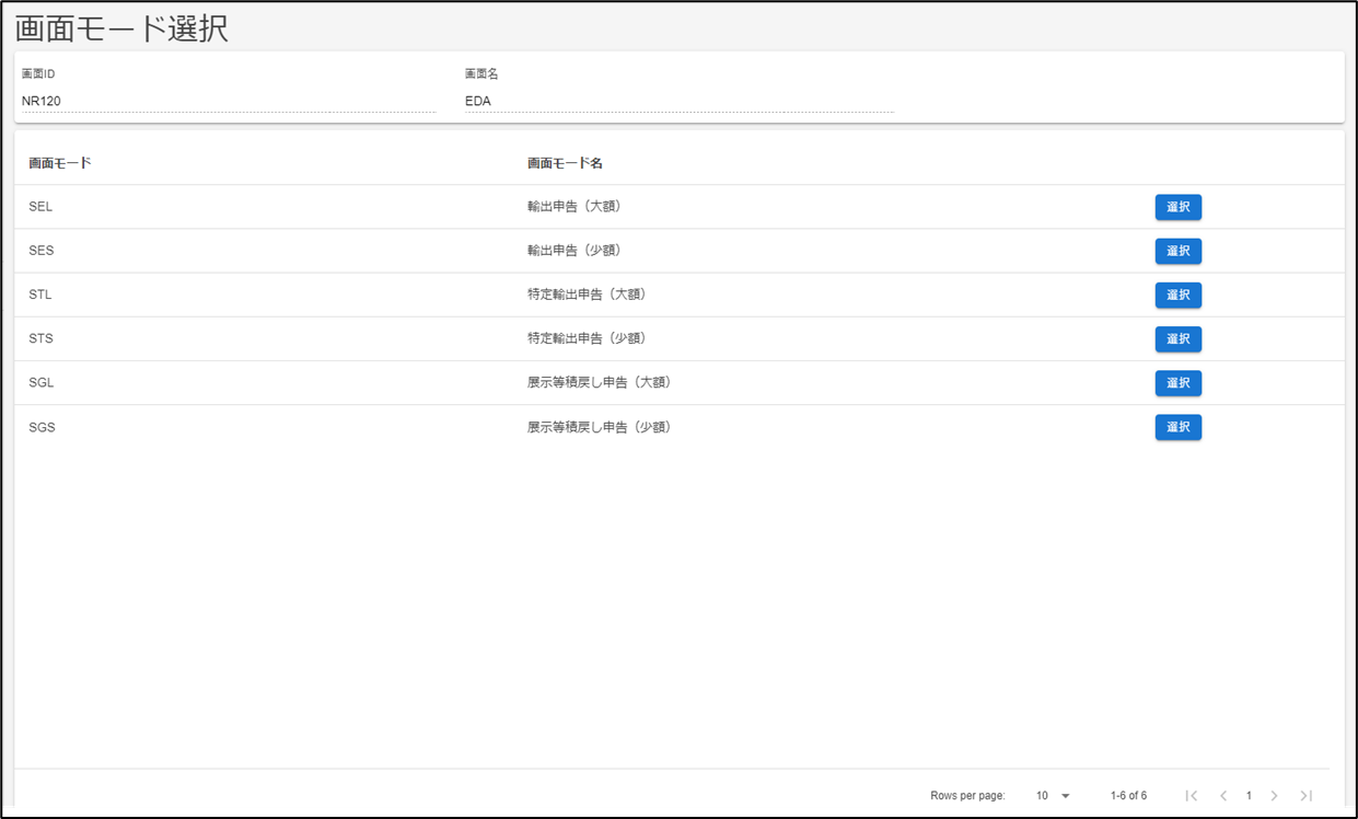 ※ EDA、IDA等の新規作成時に条件を入力する必要がある業務コードにおいては、NACCS連携用帳票の新規作成時に「画面モード選択」画面にて条件を入力してから、NACCS連携用帳票の画面に遷移します。