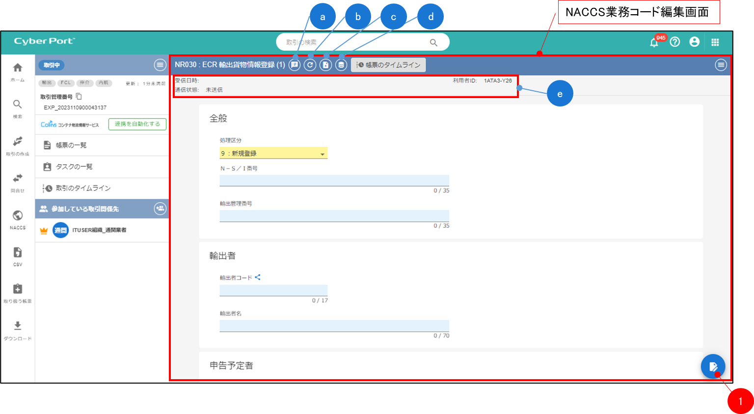 | d | NACCS情報表示切替ボタン | 本ボタンを押下することで、当該情報の表示部がヘッダー部に開きます。 NACCSの処理結果に含まれる管理番号等の情報を表示します。 NACCS情報の表示仕様は、「NACCS連携関連資料」をご参照ください。 |