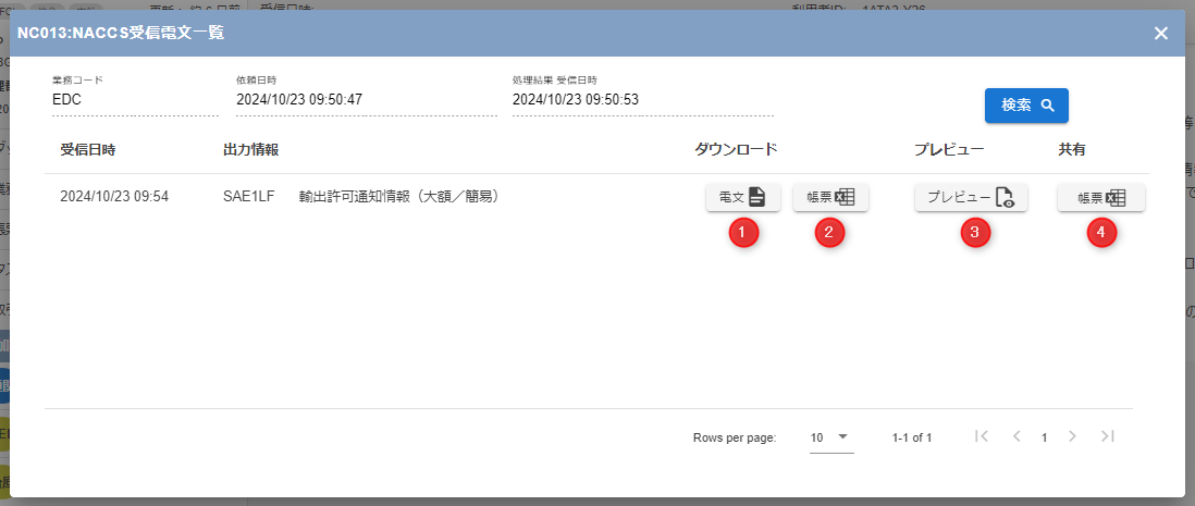 | c | NACCS出力情報ファイルダウンロードボタン | NAACSから出力される出力情報ファイルのダウンロード等を行います。 ・出力情報電文ファイルのダウンロード ・申告控えや許可通知書等の帳票Excelのダウンロード ・申告控えや許可通知書等の帳票Excelのプレビュー ・申告控えや許可通知書等の帳票Excelの共有 |