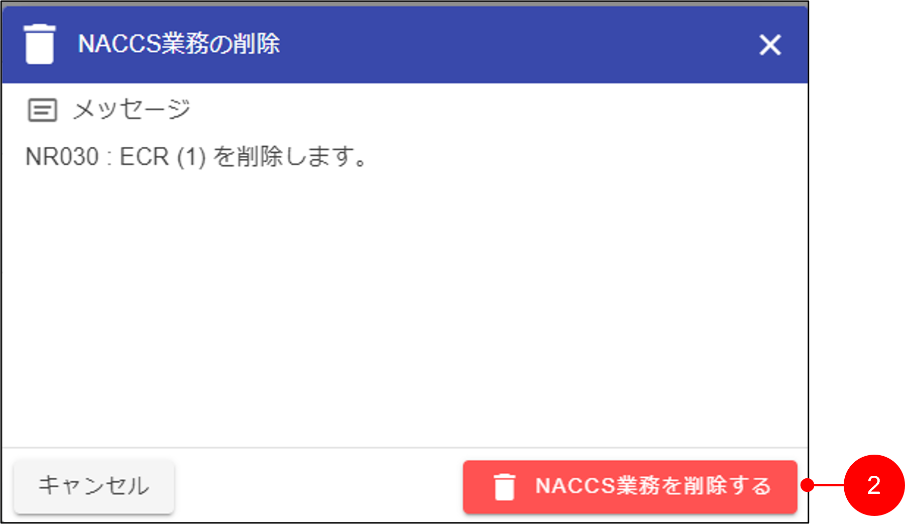 「NACCS連携用帳票編集画面」の帳票メニュー「NACCS業務を削除」を押下すると、「NACCS連携用帳票の削除画面」が開きます。