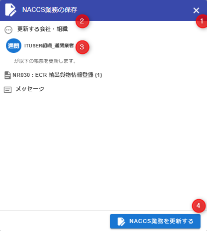 NACCS連携用帳票の保存をキャンセルして「NACCS連携用帳票の保存画面」を閉じます。