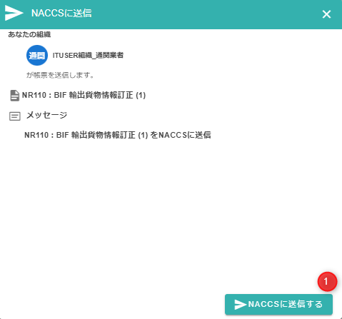NACCSに送信を行うと、利用者に予め紐付けられたNACCS利用者に対し、NACCSの利用料金が発生します。