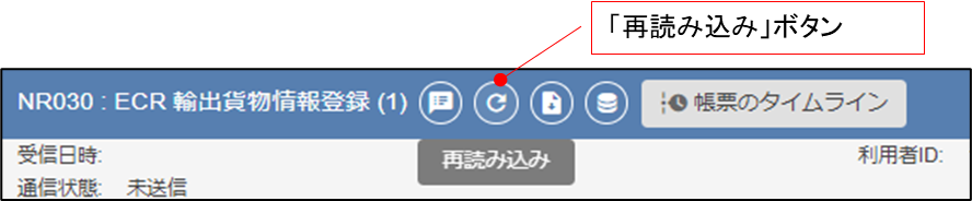 NACCS連携用帳票画面にて、画面上部の「再読み込み」ボタンを押下することで、処理結果を取得することができます。