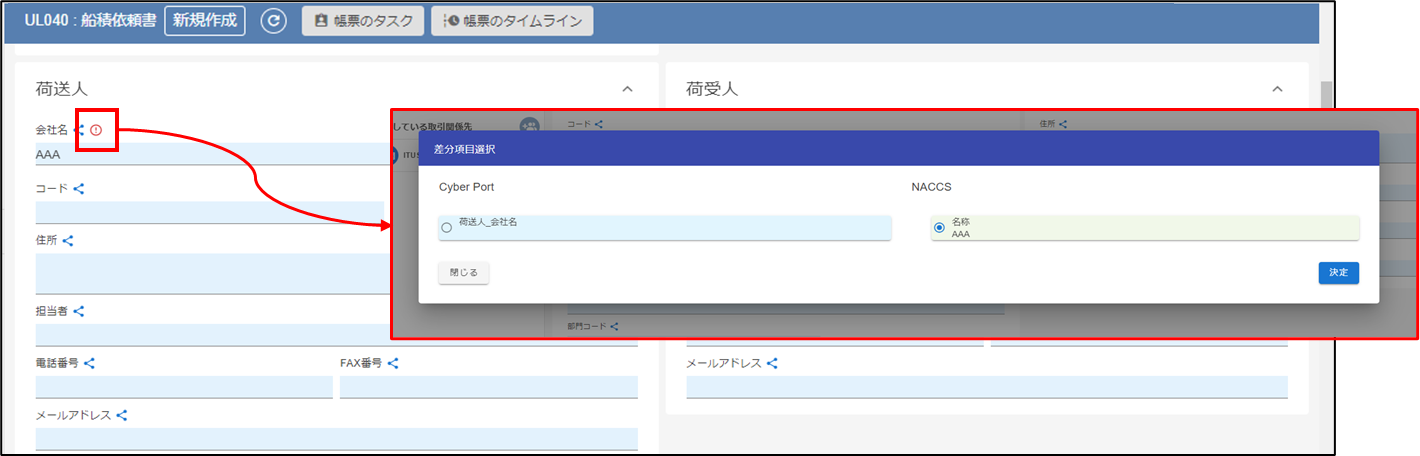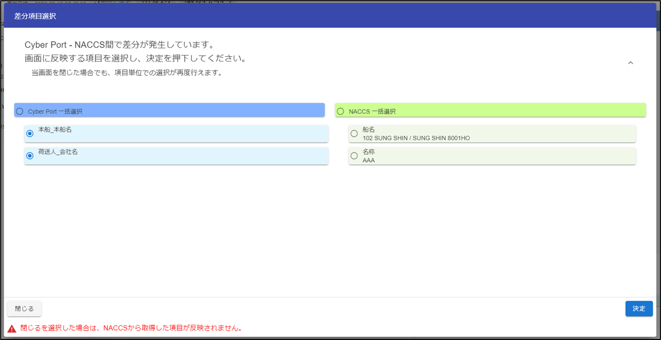 反映したい帳票を選択すると、NACCSへの照会結果とサイバーポートの持つデータの差分を表示します。