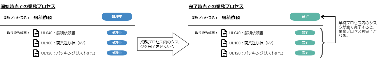 これらの業務プロセス内のタスクが全て完了すると、業務プロセスも完了となります。