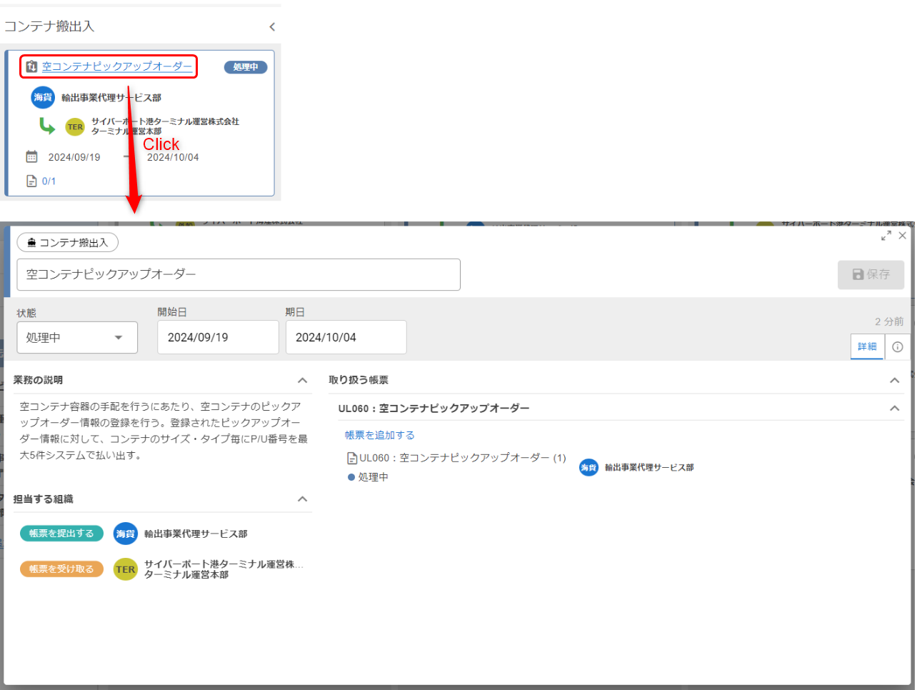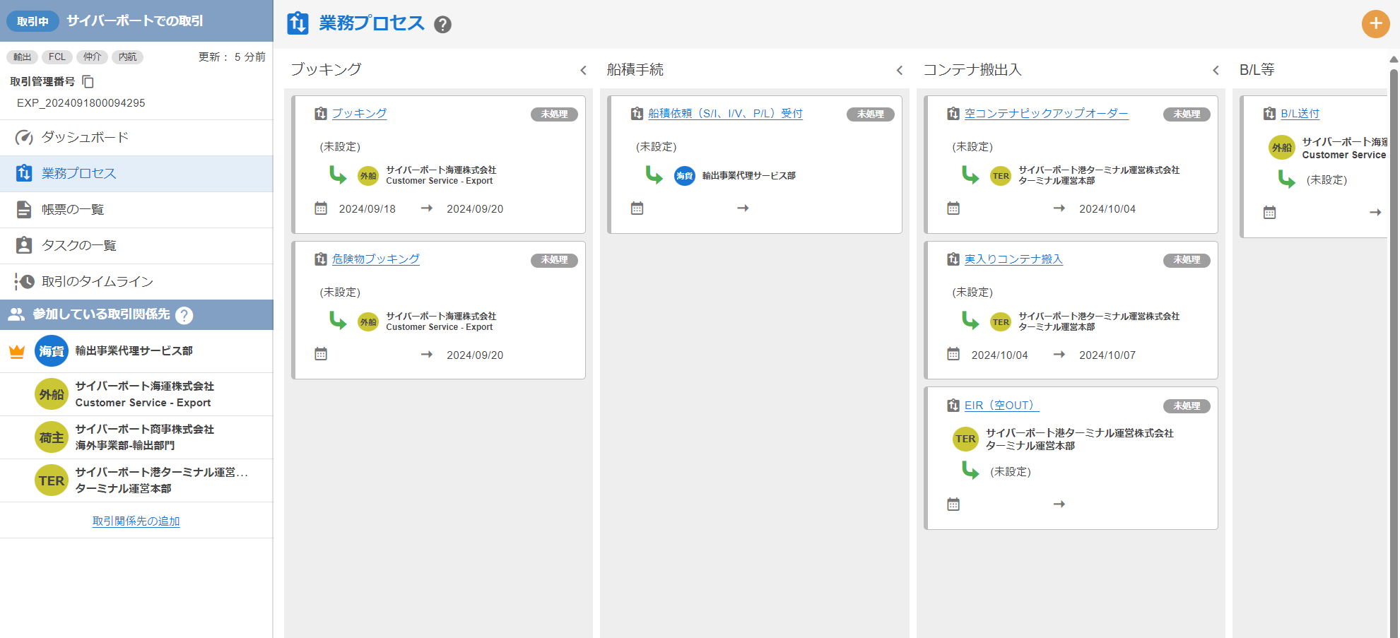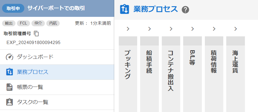 取引内での業務プロセスの状況は、以下の画面で確認できます。