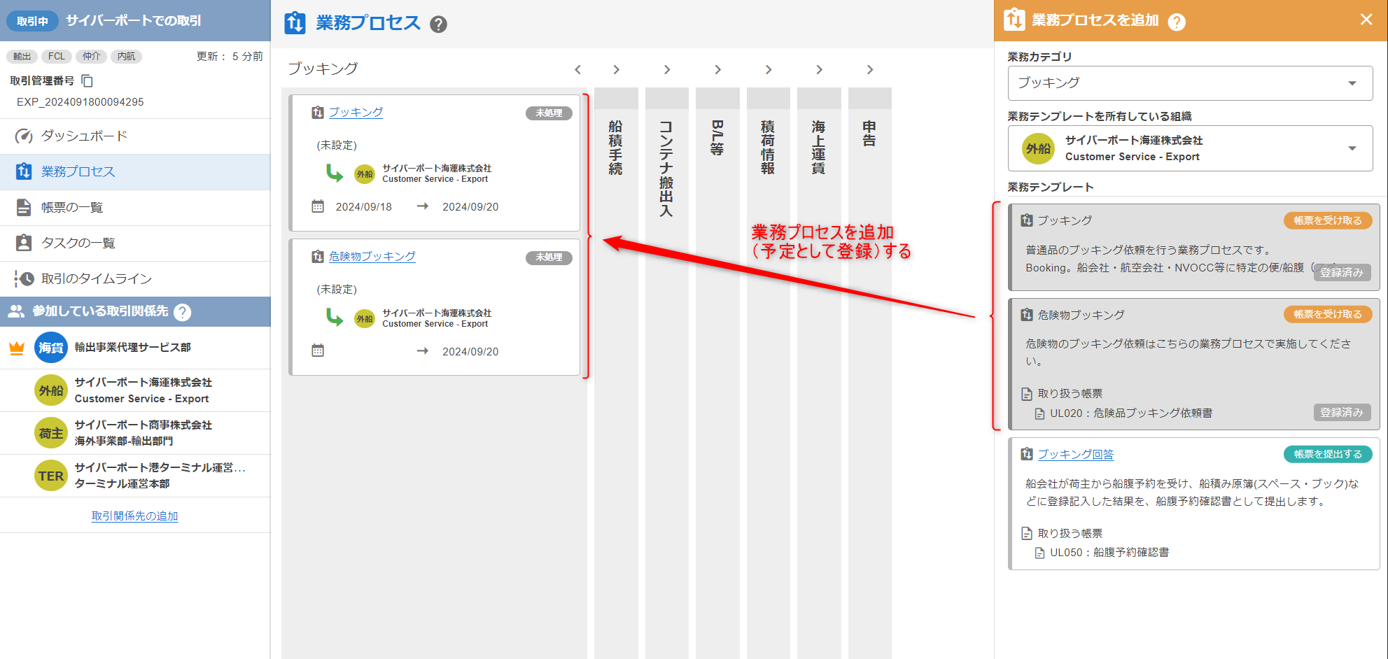 まずは、取引関係先が定義している 業務テンプレート のうち取引で実施したい業務を、業務プロセスとして取引に追加します。