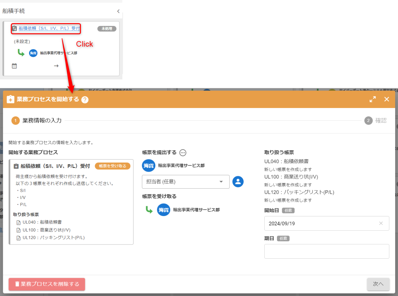 業務プロセスの開始は、状態が「未処理」である業務プロセスのタイトルをクリックすると、業務プロセスを開始する ダイアログが開くので、このダイアログに従い、業務プロセスを開始します。