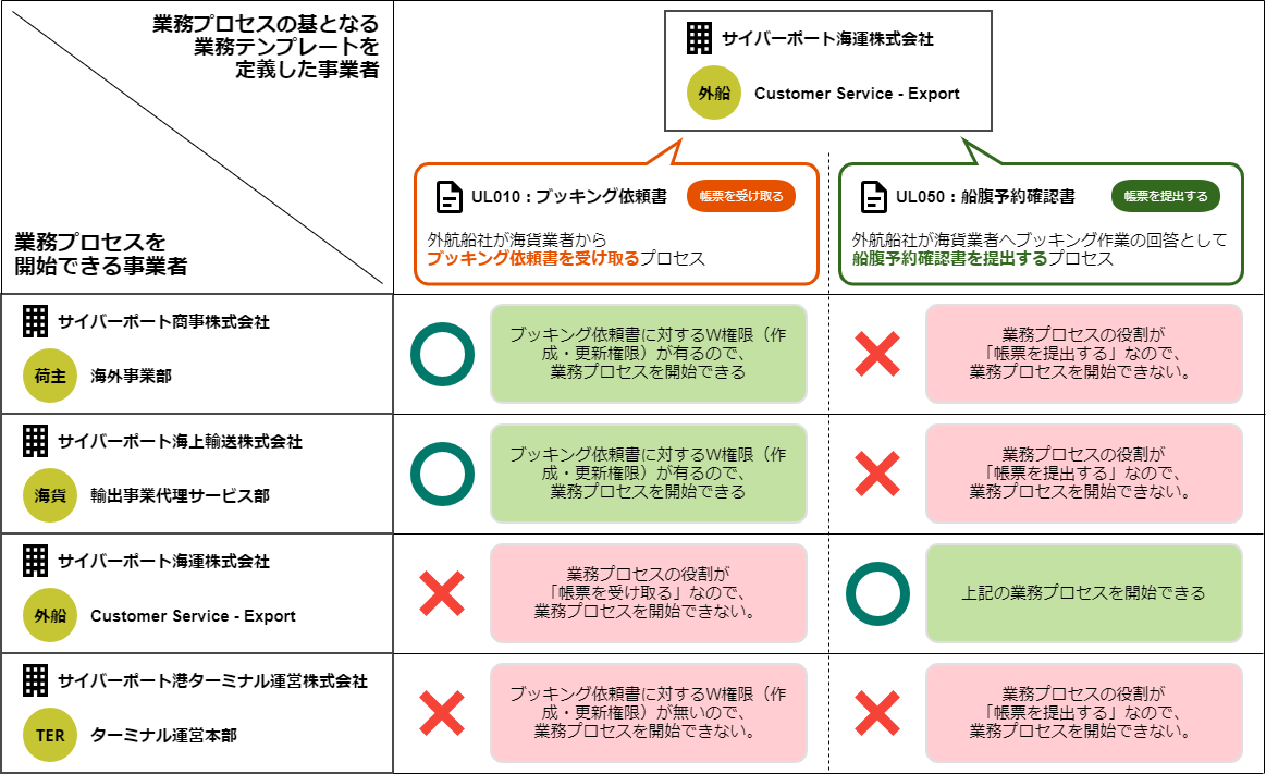 業務プロセスを開始できる取引関係先は、業務プロセスの「役割」と、「取り扱う帳票」に対して、取引関係先が所有しているRW権限で決定します。