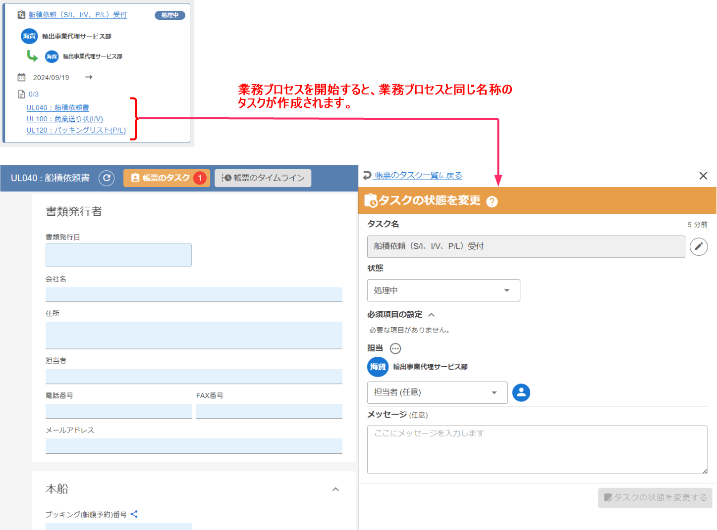 業務プロセスを開始すると、そのプロセスで「取り扱う帳票」として定義された帳票が作成(すでに存在している場合はその帳票を使用します)され、さらに「必須項目の設定」に従い、タスクが作成されます。