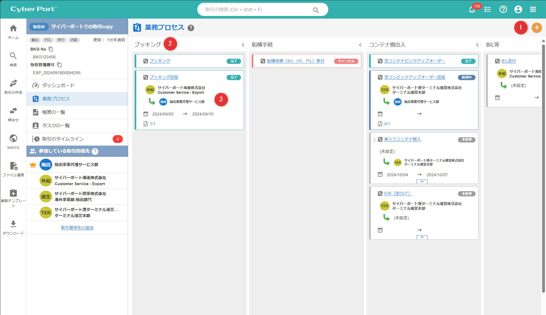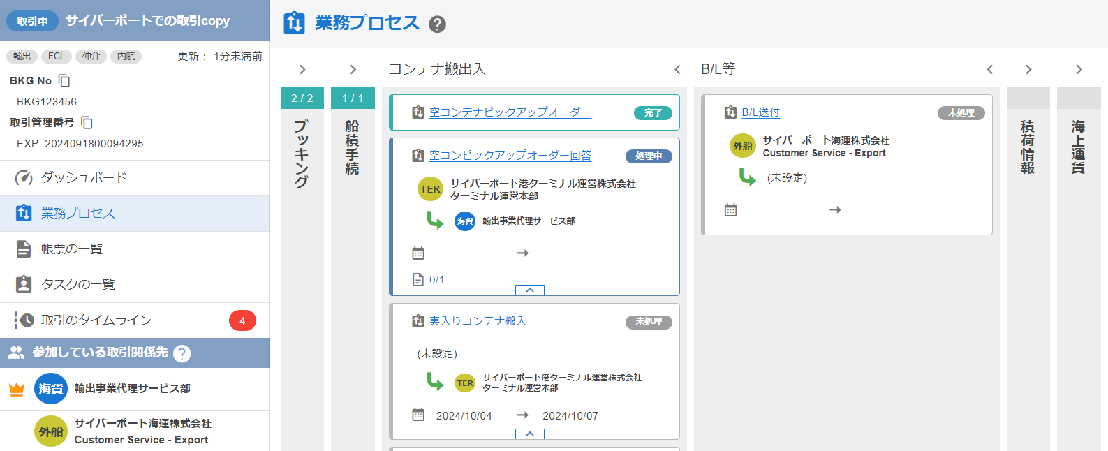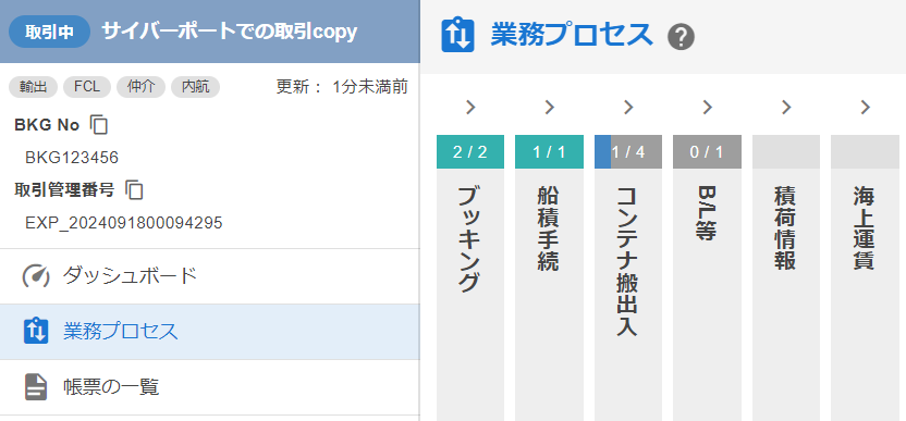 取引内での業務プロセスの状況は、以下の画面で確認できます。