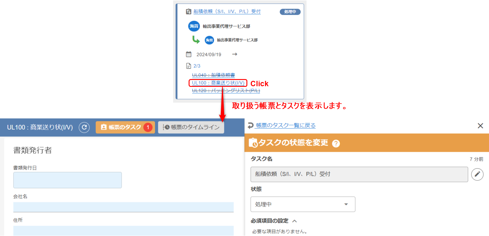 帳票名のリンクをクリックすると、その帳票の編集画面がタスクと共に開きます。