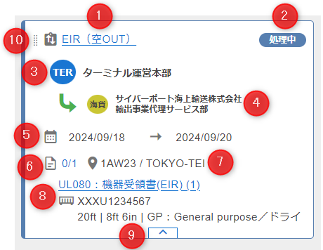 コンテナ単位で扱う帳票1の場合は、帳票名の下にコンテナ番号を表示します。コンテナの長さ・高さ・タイプも帳票内で値が入力されていれば表示します。
