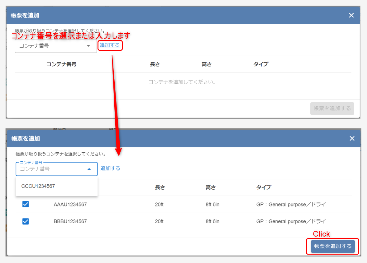 コンテナ情報について、コンテナ番号は常に表示し、長さ・高さ・タイプは帳票内で値が入力されていれば表示します。