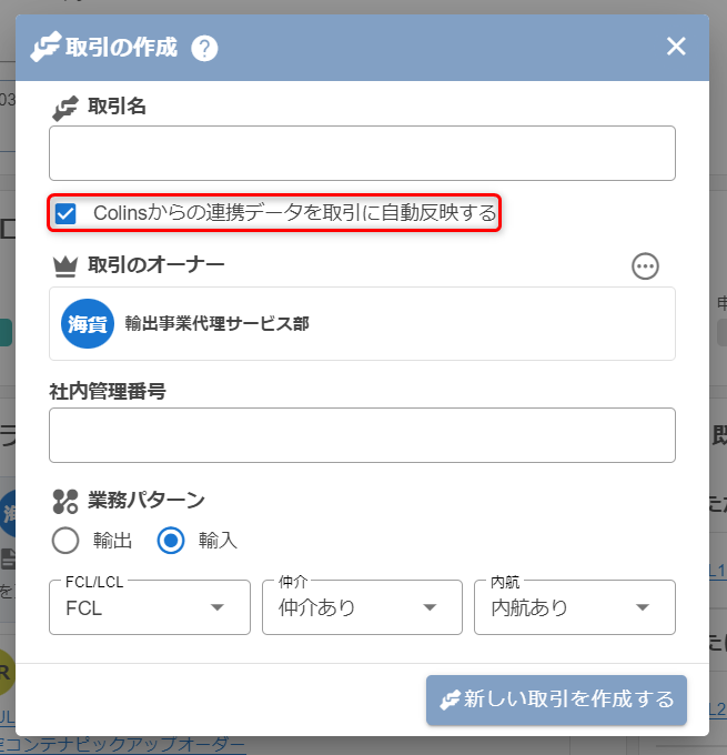 取引を新規に作成するときに、「Colinsからの連携データを取引に自動反映する」にチェックを付けた状態で取引を作成すると、自動反映が有効になります。