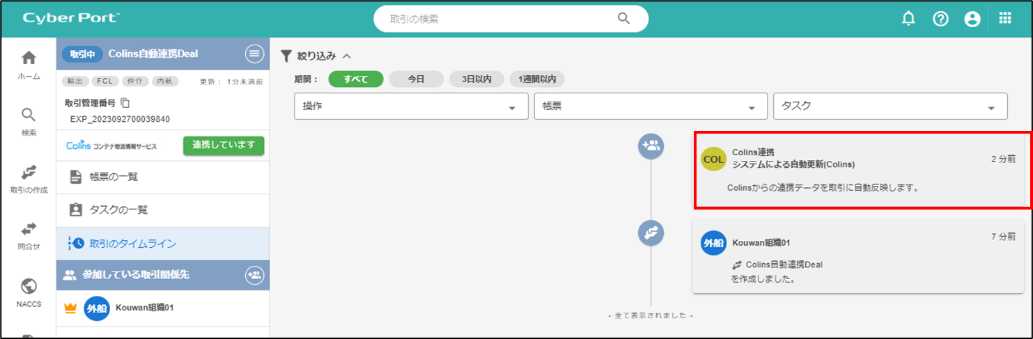 取引のタイムライン画面で、連携の自動反映が有効になったことが確認できます。