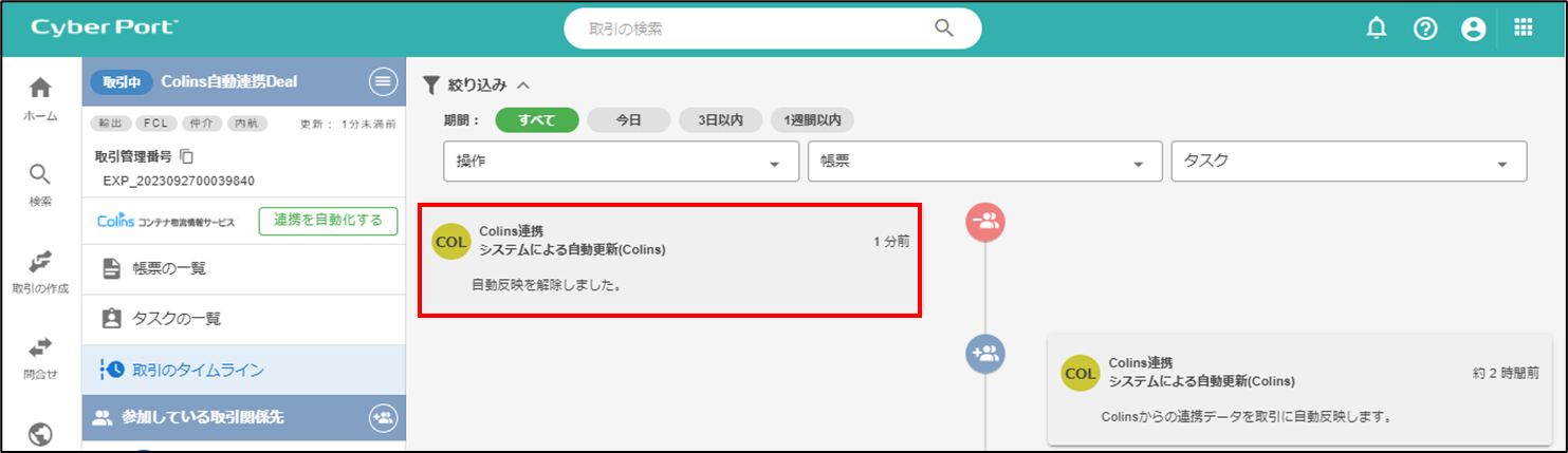取引のタイムライン画面で、連携の自動反映が無効になったことが確認できます。