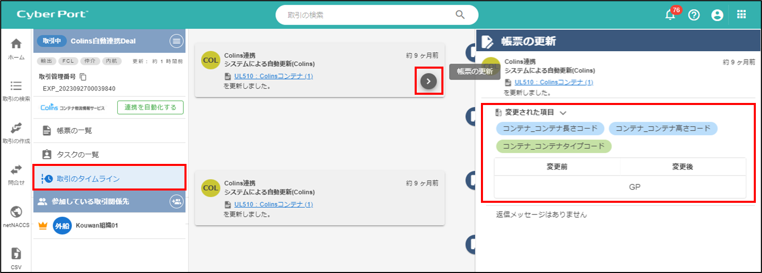 Colins連携データの自動反映が行われた場合、取引のタイムライン画面にて、変更された項目と変更内容が参照できます。
