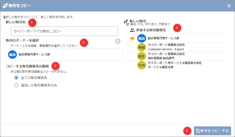 先の「取引のオーナーを選択」、「コピーする取引関係先の範囲」での選択に従い、取引を作成(コピー)した場合の、「参加する取引関係先」を表示します。