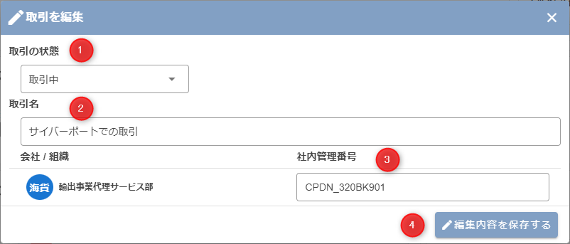 作成・参加している取引について、取引名を変更したり、社内管理番号を変更する場合は、この画面を使用します。