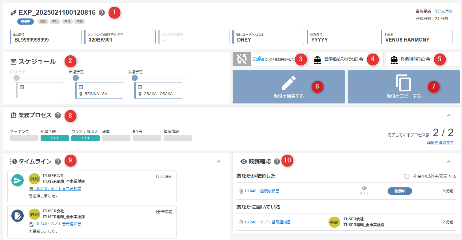 取引ダッシュボードは、表示している取引についての概要、スケジュール、業務プロセス、タイムライン、既読確認を表示するウィジェットなどから構成されています。