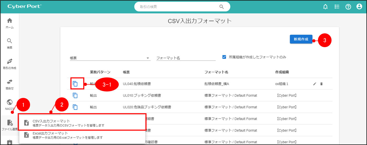 3-1)登録済のフォーマットをコピーする場合は、対象明細左部の「コピー」アイコンを押下する事で「CSV 入出力フォーマットコピー」が表示されます。